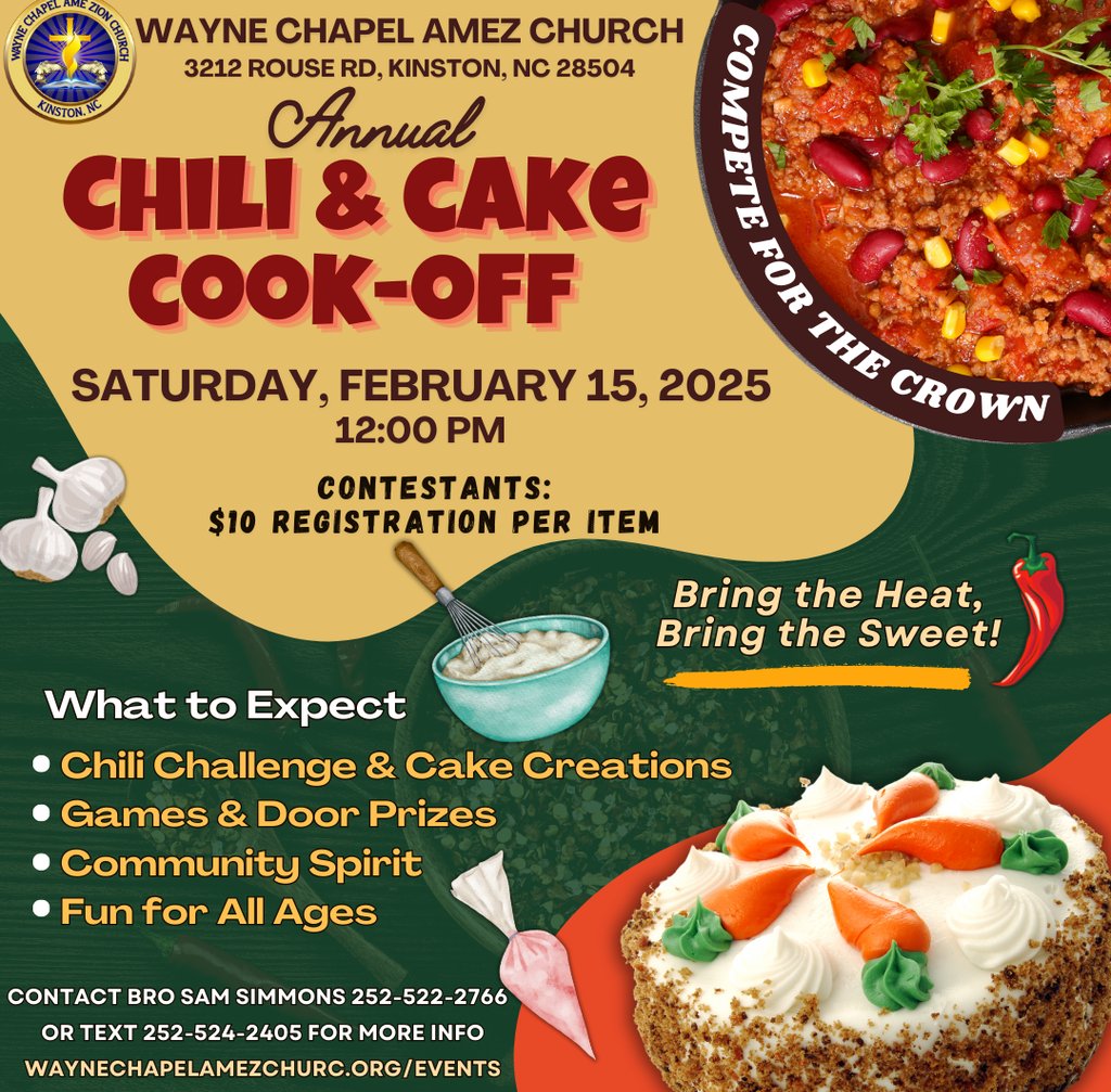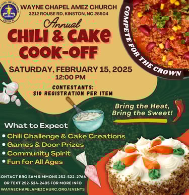 Join us for an unforgettable day of friendly competition, delicious food, and community fun at Wayne Chapel AME Zion Church’s Chili & Cake Cook-Off! Whether you're a culinary enthusiast, a master chef, or someone who just loves good food, this event is for you.